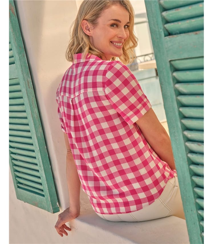 Pour un style estival facile, ne cherchez pas plus loin que cette chemise à manches courtes à carreaux roses et blancs. Dotée d'une patte de boutonnage et d'un col, elle s'associe parfaitement à votre jean préféré lorsque vous vous promenez au soleil.